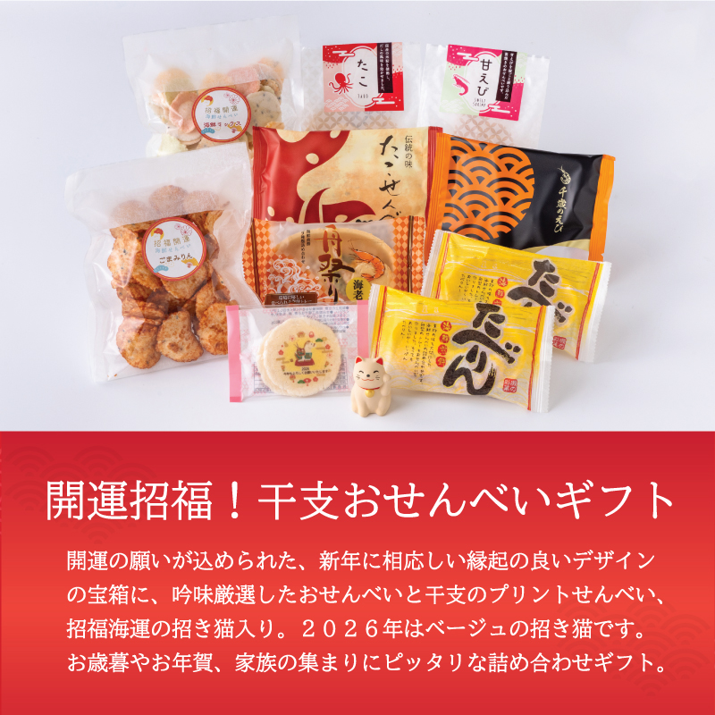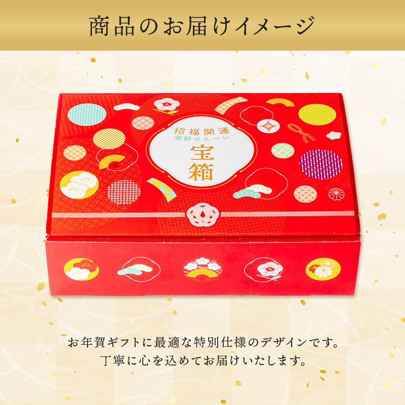 吟味厳選したおせんべいを縁起の良いデザインの『宝箱』に詰合わせました。