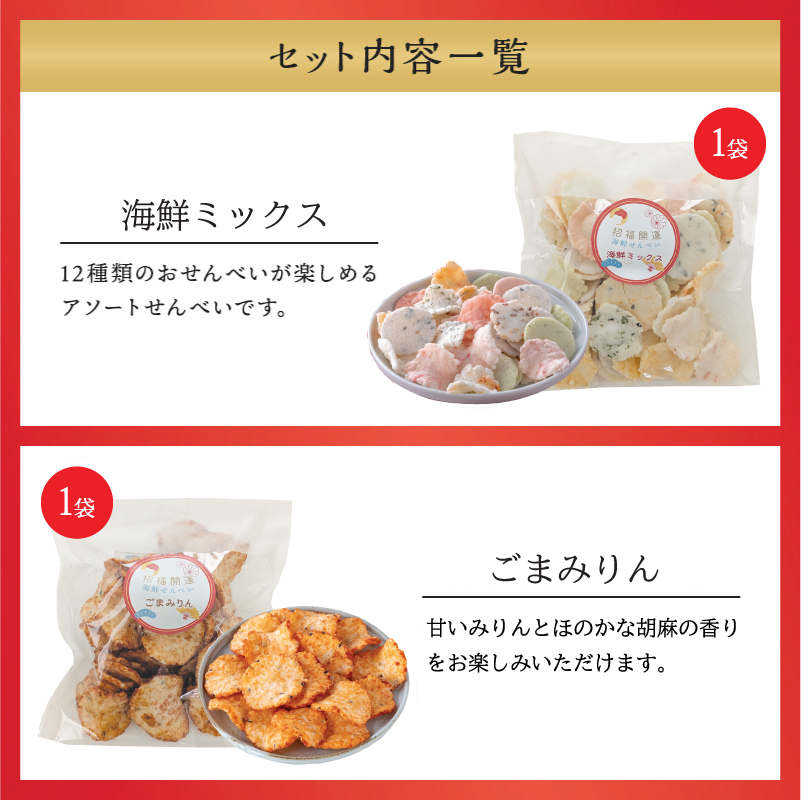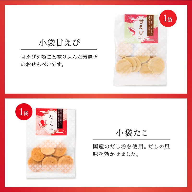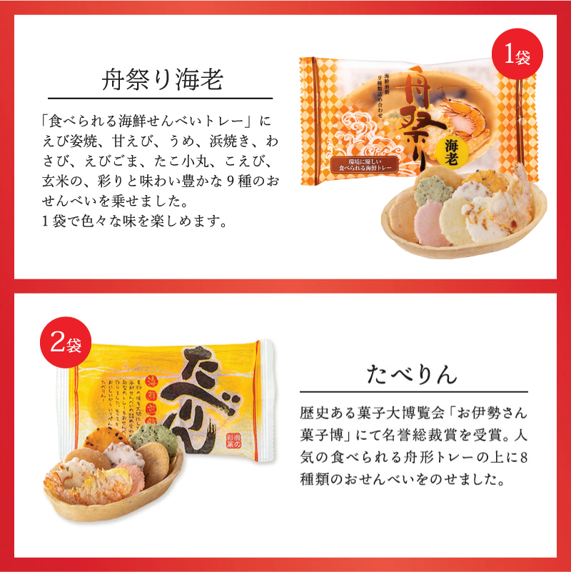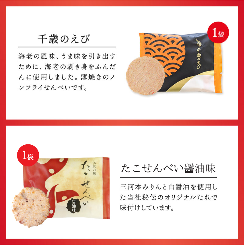 ・たべりん×2袋 ・プリントせんべい(2枚×1袋)×1袋 ※2枚のうちプリントせんは1枚目のみ ・千歳のえび(2枚×2袋)×1袋 ・たこせんべい醤油味(2枚×2袋)×1袋 ・舟祭り海老×1袋 ・甘えび(20g)×1袋 ・たこ(20g)×1袋 ・海煎ミックス(65g)×1袋 ・ごまみりん(50g)×1袋 |