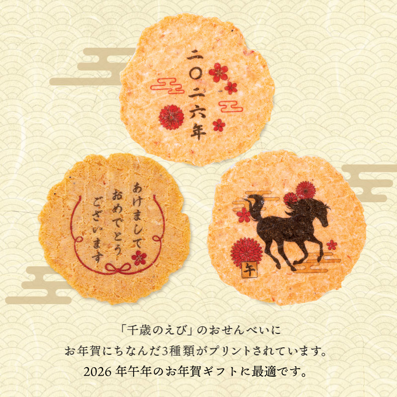 末永く多くの方に幸せが訪れるように、そして末永くえびせん家族の愛される商品になってほしいという願いを込めて開発した『千歳のえび』に、お年賀にちなんだ3種類がプリントされています。2026年午年のお年賀ギフトに最適です。