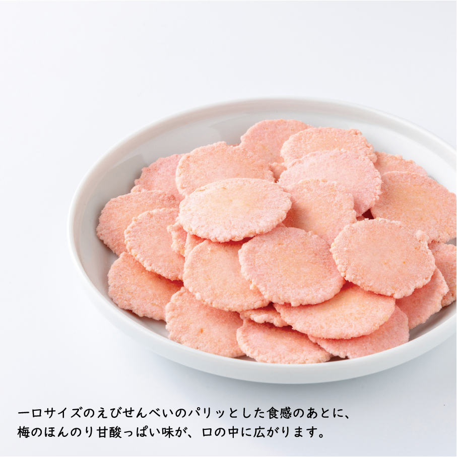 一口サイズのえびせんべいのパリッとした食感のあとに、梅のほんのり甘酸っぱい味が、口の中に広がります。梅好きにはたまらない一品です!