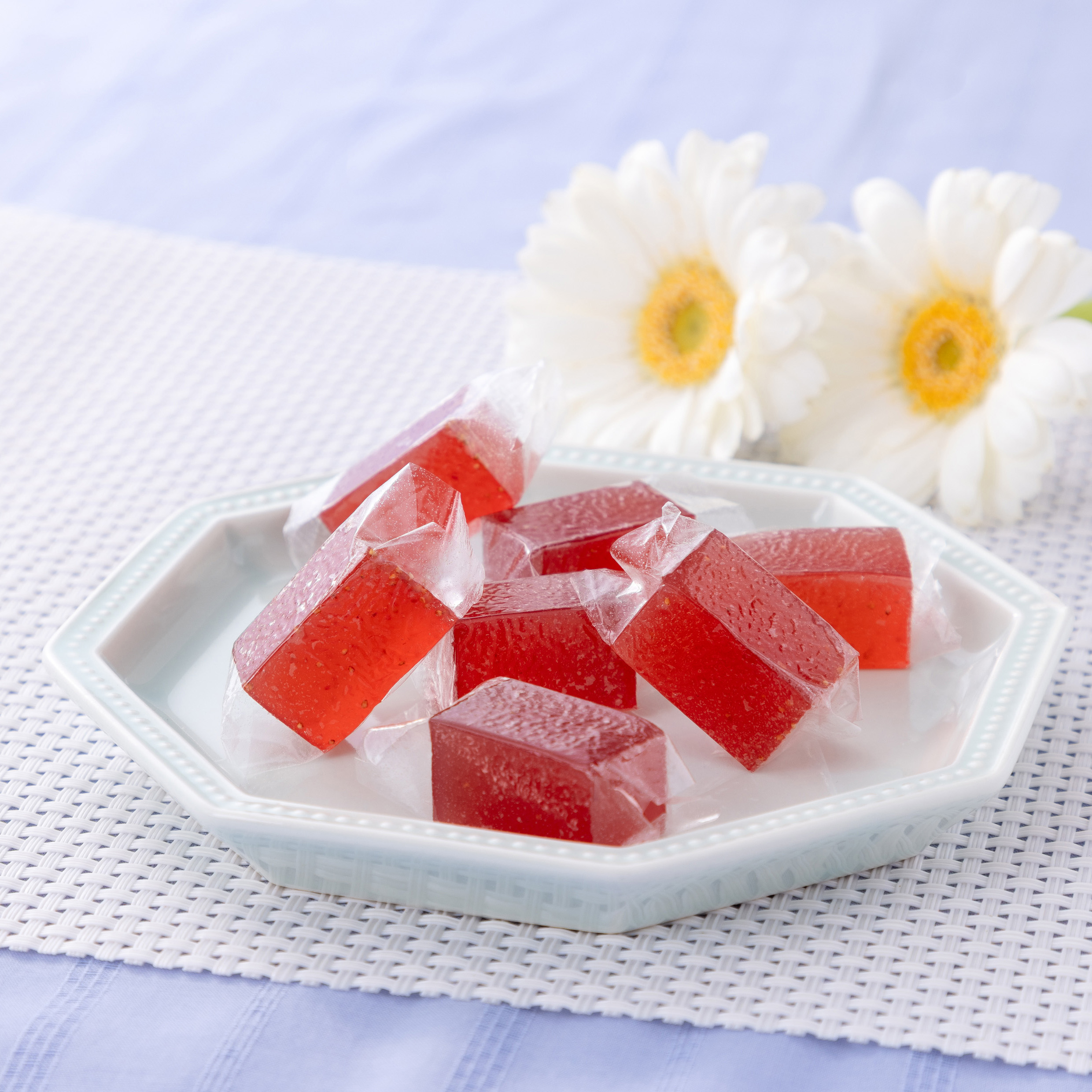 ホワイトチョコを使用した、口どけなめらか食感のオリジナルいちごの寒天ゼリーです。一粒一粒オブラートに包まれています。