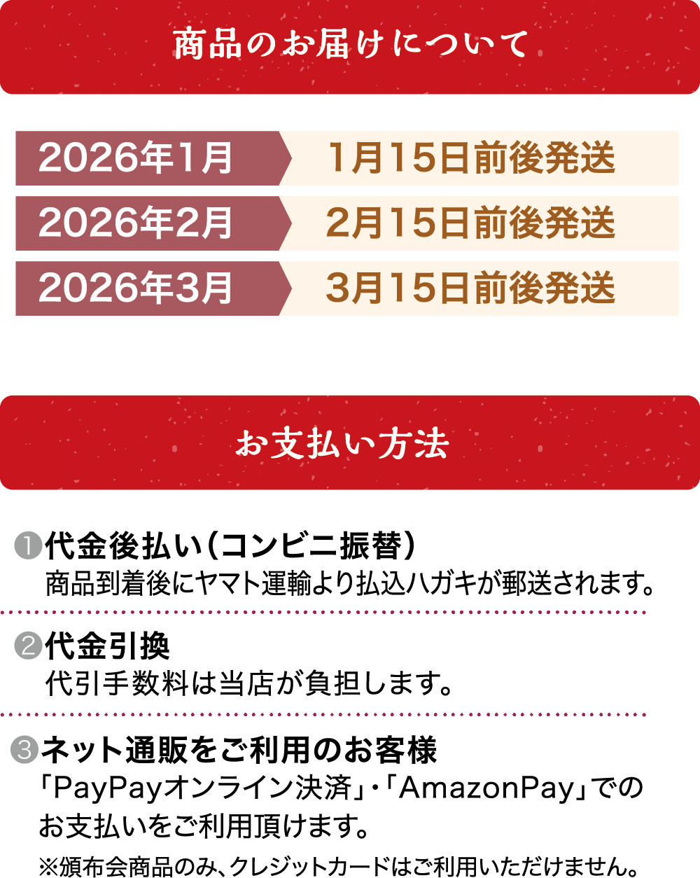 コンビニ後払い・クレジットカード払い・代金引換をご選択いただけます。