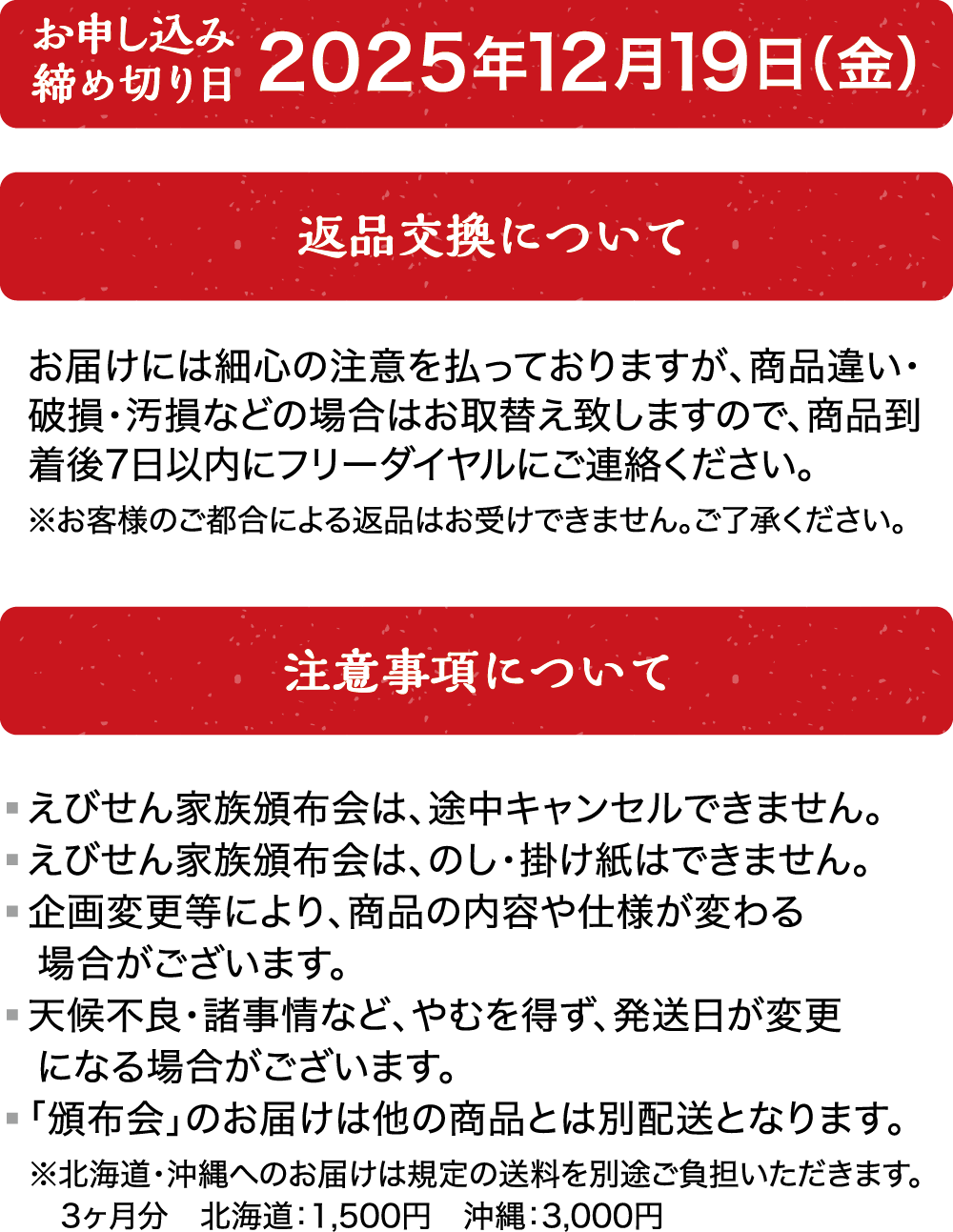 本「頒布会」は1回のご注文で、3ヶ月間毎月えびせん家族商品の詰合せをお届けします。